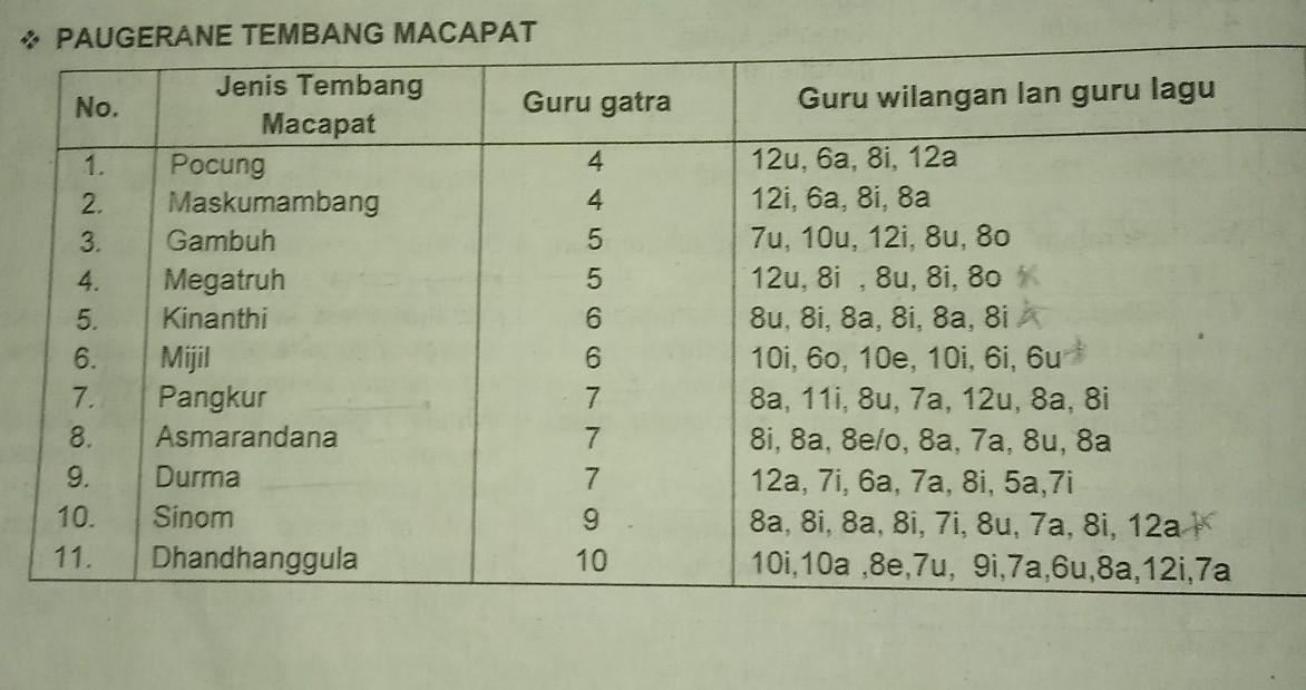 Cacahing gatra (ukara/larikan) saben sapadha. 2 x 45 menit i. Tolong jawab semua jangan asal asal nanti gue laporin nanti kalau jawabnya bener nanti gue follow brainly co id. Cakepan tembang iki sejatine ora beda karo wangun geguritan kang banjur dilagokake. paugerane gambuh ana 3, yaiku guru gatra, guru lagu lan guru wilangan.